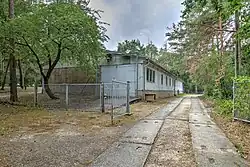 The entire area was divided into an inner and an outer security zone and surrounded with chain-link fencing. The fences further divided the facility into three outer areas: north, east, and south.[2] The commandant's bungalow was located in the south area, near the southern entrance.[3] The east area had three bungalows, the middle of which was used by the commandant's deputy in his absence. These bungalows also served to disguise the grounds as a company holiday complex.[4] Only specially qualified Stasi employees had access to the inner zone in which the actual bunker was located.[2] The site was secured by a commandant at the rank of major, his deputy, and about six guards, as well as several dogs.