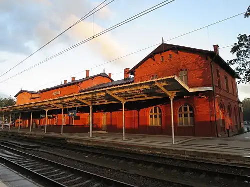 Lębork railway station is a railway station serving the town of Lębork, in the Pomeranian Voivodeship, Poland. The station opened in 1870 and is located on the Gdańsk–Stargard railway. The train services are operated by PKP, Przewozy Regionalne and SKM Tricity.