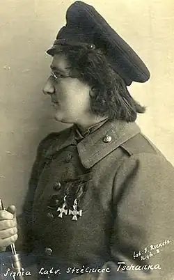 After her true sex was revealed in 1915, she continued to serve within the Pavasaru manor in Sloka and despite being wounded, she remained in the frontlines and continued the battle under continuous enemy fire until she was wounded a second time.[1] In 1916, she participated in all the battles for the defense of Nāves Sala in the summer and fought in the Christmas Battles at Tireļpurva, as a senior paramedic and selflessly continued her service under continuous enemy fire. During her service within Russia, she was awarded the Order of Saint George, III and IV class as well as promoted to the rank of corporal.[3][4][5]