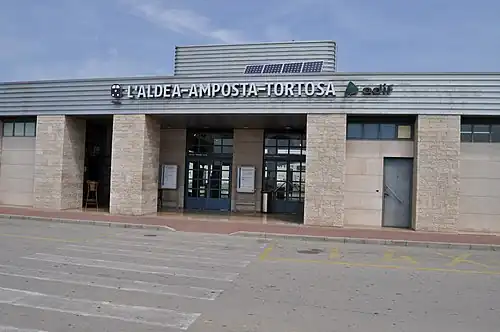 L'Aldea-Amposta-Tortosa railway station is the central railway station of L'Aldea, Spain, while it also serves the areas of Amposta and Tortosa. The station is situated on the Valencia−Sant Vicenç de Calders railway and is part of Adif and it accommodates RENFE long-distance and Rodalies de Catalunya medium-distance trains.[1][2][3]