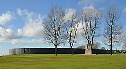 The memorial consists of an 1132-foot perimeter ellipse (about the length of 3.75 football fields) constructed out of stainless steel panels and concrete,[1] with a 200-foot portion elevated off of the ground. The panels are arranged facing inwards on the ring and list the 579,606 casualties in Nord-Pas-de-Calais between 1914 and 1918.[2] Each of the 500 panels is 10 feet in height, and is engraved with the names of approximately 1,200 men,[3] with the 500th panel remaining blank so that any newly discovered names may be inscribed. The names are listed alphabetically, rather than by nationality, starting with "A, Tet" and concluding with "Zschiesche, Paul". It resides around 550 feet away from France's largest military cemetery at Ablain Saint-Nazaire,[2] the site of the three Battles of Artois[4]