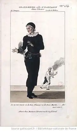 Harpagon's servants with minor roles include Brindavoine,[12] La Merluche,[12] and Mistress Claude, a cleaning woman with no lines.[13] In the last act appears a Magistrate[a] who investigates the theft of the cash-box[14] with his Clerk, who has no spoken part.[15]