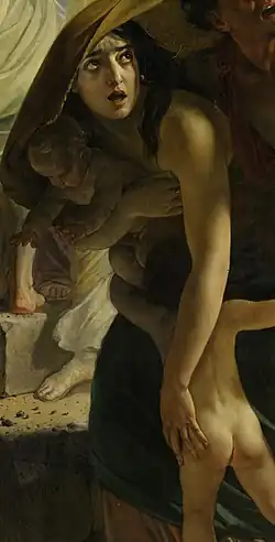 L'ultimo giorno di Pompei influenced either directly or indirectly several other 19th-century works. When word had reached Paris of the 1827 La Scala production, which the Revue de théâtre described as representing the eruption of Vesuvius "with a frightful truth and a grandeur unthinkable in France," the French scenographer Pierre Cicéri travelled to Milan to study Sanquirico's designs and stage machinery.[5] He incorporated several of those elements into his staging of Auber's 1828 opera La muette de Portici which featured a 17th-century eruption of Vesuvius. Pacini's opera was also one of the inspirations for Karl Bryullov's painting, The Last Day of Pompeii. The painting incorporates portraits of Pacini's young daughters, Amazilia and Giovannina, depicted as children sheltered in the arms of a Pompeian woman. The model for the woman was Yuliya Samoylova who was the foster mother of Pacini's daughters and had been the lover of both Pacini and Bryullov.[6] In turn, Bryullov's painting inspired Bulwer-Lytton's widely read novel, The Last Days of Pompeii. Amongst the many film and theatrical works based on Bulwer-Lytton's novel was Errico Petrella's opera Jone, ossia L'ultimo giorno di Pompei, which premiered in 1858 and remained in the repertory both in Italy and internationally until well into the 20th century.[7]