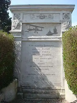 There remains a memorial to Capitaine Louis Gabriel Madiot, Capitaine Dubois and Lieutenant Peignian, who all died in the crash of a Bréguet aircraft on 23 October 1910.[13] It was erected on 7 October 1923, and is located by the roadside in the area of the original Breguet workshops.