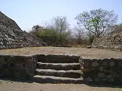 Located south of the square, its rectangular base is 52 by 36 m; it is large and its construction is based on overlaid and stepped platforms. On top has a rectangular temple, inside has several circles. Access is by several broad stairs ornamented by four cubes. The steps have different heights: the first are significantly higher than the others.