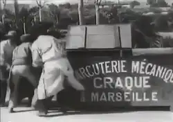 La Charcuterie mécanique (The Mechanical Butcher) is an 1895 "humorous subject" (as classed by its makers) created by the Lumière Brothers. In Phil Hardy's The Aurum Film Encyclopedia: Science Fiction it is listed as the first ever science fiction film.[1] The action involves a live pig that is placed into a machine (essentially a large wooden container). The pig is then turned into various pork products, which are lifted out of the other end of the machine.