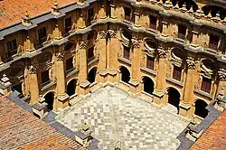 Also, by Andrés García de Quiñones, it presents a space closer to the courtyard of a royal palace than to the cloister of a religious building. The first two sections are divided by semicolumns of compound order, with an arched gallery on the first floor and balconies crowned by oculi on the first floor, accessed from the street and the church. On the third-floor balconies between flat pilasters.
