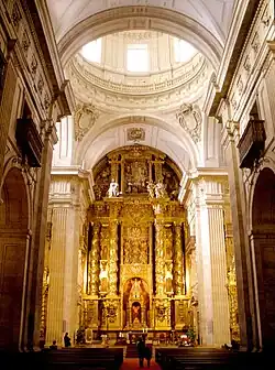 The church's interior has a single nave with chapels between buttresses, following the Jesuit scheme of the Roman church of Il Gesú, with four bays and a wide transverse nave that does not protrude. The construction is dominated by Tuscan pilasters with Scurialian reminiscences. The side chapels have balconies for the use of the Jesuits. The great dome that illuminates the interior is also the work of the Jesuit architect Mato, having the same height as the nave of the church, 50 m, and reinforced on several occasions due to its magnitude.