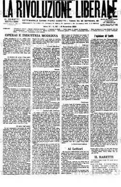 La Rivoluzione Liberale (Italian: Liberal Revolution) was an Italian anti-fascist liberal magazine, which was published on a weekly basis in Turin between 1922 and 1925. The magazine is mostly known for its founder Piero Gobetti.