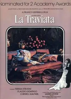 La Traviata is a 1982 Italian film written, designed, and directed by Franco Zeffirelli. It is based on the 1853 opera La traviata with music by Giuseppe Verdi and libretto by Francesco Maria Piave. Soprano Teresa Stratas, tenor Plácido Domingo, and baritone Cornell MacNeil starred in the movie, in addition to singing their roles. The film premiered in Italy in 1982 and went into general release there the following year. It opened in theatres in the U.S. on April 22, 1983. The movie's soundtrack with James Levine conducting the Metropolitan Opera Orchestra and Chorus won a Grammy Award for Best Opera Recording.