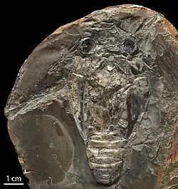 Some soft parts of organisms are preserved as phosphatised concretions, in exceptional cases down to cellular details, e.g. retinal structures in the eyes of conchyliocarid crustacea.[2] Apart from Beecher's Trilobite Bed and the Hunsrück Slate, La Voulte-sur-Rhône is the only other locality where extensive pyritization of soft parts occurs.[3] However, pyritisation is not the only preservation pathway; several stages of mineralization (originally phosphate followed by calcite or gypsum, then pyrite and finally galena) are seen, each successive mineralization event degrades the detail preserved, with only gross morphological features preserved in the most advanced stages.[4]