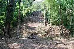 Over 120 inscriptions have been identified on the various monuments from the site.[16] The major groups are the Central Acropolis, the West Acropolis and the South Acropolis. The South Acropolis occupies the highest part of the site.[16] The site is aligned with relation to the Usumacinta River, at times causing unconventional orientation of the major structures, such as the two ballcourts.[17] The site is relatively natural with howling monkeys, bats, toucans and other wildlife to be seen in and around the buildings.[6]