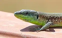 The earliest known members of the genus Lacerta are known from early Miocene epoch fossils indistinguishable in anatomy from the modern green lizards such as Lacerta viridis.[2] Some fossil species from the ice-age mediterranean, such as Lacerta siculimelitensis, reached especially large sizes.[3]