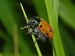 These beetles are 75โ10 millimetres (2.95โ0.39 in) long, the head and pronotum are black, the elytra are bright yellow-orange, with six black dots.