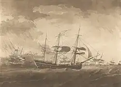![]() Robert Dodd: Lady Juliana in tow of the Pallas Frigate. The Sailors Fishing the main Mast which was shatter'd by Lightning.