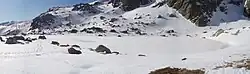 It is surrounded by meadows and rocky areas (gneiss) that have some high mountain scrubs such as piorno and creeping juniper. Since the lake remains frozen from December to March due to the sub-zero temperatures in the area, no fish inhabit its waters, but there are amphibians and birds living there, such as the bluethroat, northern wheatear, the hedge sparrow, and the rock thrush.[3] The environment of the lake has a maximum degree of protection within the Peñalara Natural Park, so visitors can only pass through certain places.[4]