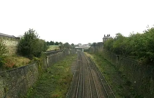 ![]() Former location of Laisterdyke railway station in October 2008, looking east from Laisterdyke overbridge. | |||||