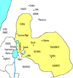 In 24 BC, the Roman Empire conquered Syria and assigned the region of Trachonitis, which was inhabited by nomadic marauders and cattle herders living in caves, to the authority of Herod the Great, king of Judaea.[8][9][2] The area was not part of Herod's original kingdom in 40 BCE but was given to him by the Romans by the end of 27 BCE.[10] To address the issue of local brigands, Herod settled 3,000 Idumaeans in Trachonitis.[11][12][13] Later, around 7 BCE,[14] Herod invited Zamaris, a Jew from Babylonia, and his contingent of 500 mounted archers to settled the village of Bathyra in Batanea (possibly near modern-day as-Sanamayn),[2][13][14] giving them an exemption from taxation.[15] This settlement, led by the family of Zamaris, was tasked with protecting the people of Batanea from Trachonite brigands and ensuring the safety of Jewish pilgrims traveling from Babylonia to Jerusalem.[14][16] According to Josephus, these troops were accompanied by settlers from various places who were dedicated to the "ta patria of the Jews".[17] With Herod's death in 4 BCE, Trachonitis was given to his son Philip the Tetrarch. After the latter's death, circa 34 CE, the area was incorporated into the province of Syria.[10]