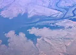 ![]() Lake Argyle seen from space, August 1985. The main channel of the Ord River (dark, meandering feature) north of the lake is visible as it drains northward, eventually emptying into the Joseph Bonaparte Gulf. Low, folded mountains can be identified east and west of this river valley. | |