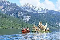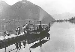 In 1879, Albin Schraml founded a steamboat company and opened the small wooden steamboat Archduke Johann on June 14, 1879. The Grundlsee shipping company changed hands several times. In 2015, Tauroa GmbH took over the company from Dietrich Mateschitz. From the end of April to the end of October, scheduled and excursion boats operate on the lake with three motorboats (Rudolf, Traun and Gössl) as well as flatboats. The scheduled boats ply a north–south course between the western and southern shores.[15] There are also several rental stations for electric boats. On Grundlsee, as on all lakes in the Inner Salzkammergut, internal combustion engines are prohibited. Exceptions are made for commercial fishing, regular shipping, and rescue and firefighting vehicles.[16]