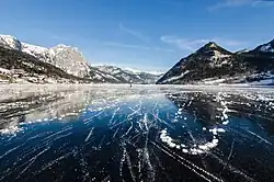 The ice-age Grundlsee local glacier, which originated from the high plateau of the Totes Gebirge and flowed into the Aussee basin, also followed the fault-induced zone of weakness. This widened the valley and excavated the tongue basin of Lake Grundlsee. At its western end, the glacier left behind a terminal moraine wall, which is several tens of meters high. This dammed off the lake. The first lake was formed at the edge of the ice body at the same time as the over-deepened basin became ice-free. The high edge of the debris formation around the basin of the Grundlsee indicates this phase with the ice body in the lake basin. The lake area was originally larger and extended from the Toplitz to the Kammersee during the late Würm glacial period. After the final disappearance of the ice, the alluvial cone adjusted to today's lake level. In the post-glacial period, the lake basin underwent constant change due to sedimentation, and it will likely have disappeared again in a few tens of thousands of years.[2][5]
