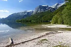The Grundlsee is not a nature reserve, but the Totes Gebirge and Altausseer See European Nature Reserve no. 35, designated as part of the Natura 2000 network under the Habitats and Birds Directives, begins on the eastern shore. The Danube bleak (Chalcalburnus chalcoides), which lives in the lake, is a protected species under the Habitats Directive and migrates to the Toplitz and Stimitz creeks during the spawning season. To create additional spawning grounds for this and other species, the Stimitz estuary was renaturalized in 2016 and an oxbow was opened to restore the connection to the lake.[14]