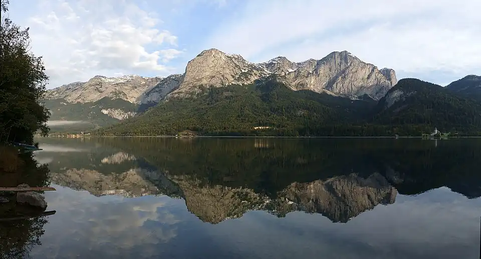 The Grundlsee is located on the southwestern edge of the Toten Gebirge formation, which is part of the Northern Limestone Alps. This overlying unit consists mainly of Mesozoic limestones and dolomites of the Triassic and Jurassic periods. The basin of Grundlsee lies along a geological disturbance running from west-southwest to east-northeast. This line, known as the Toplitzsee Fault, extends through the Toplitzsee and Kammersee lakes into the Tote Gebirge mountain range. There are remnants of terminal and lateral moraines around the lake. Tressenstein and Plassen limestones dominate the north of the lake, while Hallstätter limestone dominates the south. The eastern part, and thus the main catchment area, is formed by Dachstein Formation. The Haselgebirge mountains also occur on the southern shore near Vienna, where Saint-Gobain Rigips Austria mines the largest gypsum deposit in the Eastern Alps.[2]