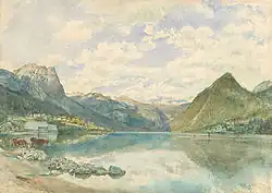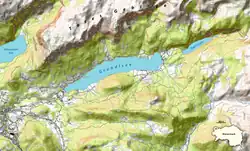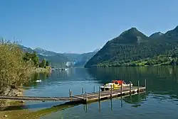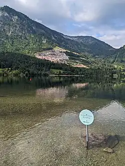 The hydrological catchment area of Lake Grundlsee has a total area of 125 km2 and lies entirely within the Totes Gebirge. The lake is primarily fed by the Toplitzbach, which drains the Toplitzsee, and the Stimitzbach. Toplitzbach and Stimitzbach flow into the eastern part of Grundlsee near each other. The village of Gößl is situated on the alluvial cone of the Toplitzbach. The district of Gaiswinkel was constructed on alluvial deposits of the Mühlbach. Like the Zimitzbach stream, the latter created a small, now populated delta into the lake in the vicinity of the district of Schachen.[2] The Grundlsee Traun leaves the lake in the west at the lake lodge, where a bridge crosses the outflow. The discharge is 5.94 m3/s. The theoretical lake retention time is 0.9 years.[3][4]