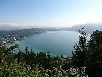 Lake Klopein (German: Klopeiner See, Slovene: Klopinjsko jezero) is a lake near the town of Völkermarkt located within the municipality of Sankt Kanzian in Carinthia, Austria. Lake Klopein is the remaining lake of previously larger lake area, which has spanned over today's Kühnsdorf area. With water temperatures reaching 29 °C it is among the warmest lakes in the Alpine region. [1][2]