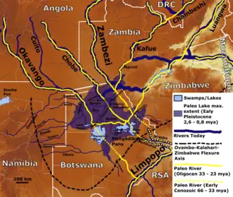 Approximately 3 million years ago, strong easterly winds formed long dunes, which ran from east to west across the middle of the Kalahari Desert. During wetter times, these dunes channeled the great rivers of the area, the Okavango, Chobe, and Upper Zambezi, southeastward to join with the Limpopo River and drain into the Indian Ocean.[4]