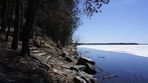 Lake Wissota State Park is a 1,062-acre (430 ha) Wisconsin state park near the town of Chippewa Falls. The park is situated on the northeast shore of Lake Wissota, a reservoir on the Chippewa River. Camping, boating, and fishing are the most popular activities. Park lands are covered in a mix of pine/hardwood forests and prairie. Visitors can access the Old Abe State Trail and bike or hike 17.5 miles (28.2 km) to Brunet Island State Park.