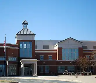 Lakelands Park Middle School was built in 2005 to resolve overcrowding in other schools in the county,[5] as a result of a unique collaborative effort between the Montgomery County Board of Education and superintendent Dr. Jerry Weast,[6] at a cost of $21 million.[7] Lakelands was designed to accommodate up to 1,200 students and is located amongst local housing to enable the students to be able to walk to school.[8] The building is 153,588 square feet (14,268.8 m2), and includes three floors, a full-size gym, auxiliary gyms, two computer labs, and rooms for art, music and technology. The media center has a collection of more than 18,000 print and non-print materials, including books, magazines, videos, DVDs and CD ROMs. The Research Learning Hub includes 32 networked computers.