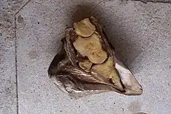 The bones of the hoof are suspended within the axial hooves of ungulates by layers of modified skin cells, known as laminae or lamellae, which suspend the bony column from the hoof wall, contributing to shock absorption during locomotion. In horses, there are about 550–600 pairs of primary epidermal laminae, each with 150–200 secondary laminae projecting from their surface.[1] These interdigitate with equivalent structures attached to the surface of the coffin bone (PIII, P3, the third phalanx, pedal bone, or distal phalanx), known as dermal laminae.[2] The secondary laminae contain basal cells which attach via hemidesmosomes to the basement membrane. The basement membrane is then attached to the coffin bone via the connective tissue of the dermis.[1]