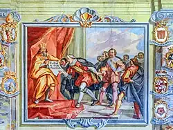 On the north wall, a fresco framed as a panel painting from 1740 illustrates the investiture of the Carinthian duke at Fürstenstein near Karnburg. The south wall features a fresco depicting the handing over of the Gabbrief (deed of donation) by Maximilian I to the Carinthian Landstände on April 24, 1518, marking Klagenfurt's designation as a provincial city. These frescoes emphasize the Carinthian Landstände's historical significance and regional pride.