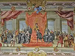 The ceiling features a fresco by Fromiller framed by elaborate mock architecture designed with perspective in mind. The surrounding portico includes niches with Grisailla statues of the Habsburg rulers Matthias, Ferdinand II, III, and IV. Instead of a celestial depiction, the fresco portrays the hereditary homage of Emperor Charles VI, which took place on August 22, 1728, in the Palais Rosenberg (now the town hall of Klagenfurt). The emperor is depicted under a red canopy, surrounded by deputies, ecclesiastical dignitaries, the duke’s farmer, and holders of eleven provincial offices. The coats of arms of these figures, along with those of Austria, Carinthia, and the ecclesiastical territories of Salzburg and Bamberg, are integrated into the design.