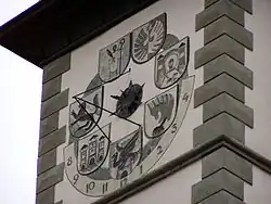 In the summer of 1938, Switbert Lobisser was commissioned by Minister of the Interior Wilhelm Frick to paint new frescoes in the conference hall for 10,000 Reichsmark, entitled "Carinthia's Homecoming into the Reich".[10] Concurrently, the Landhaus received a new façade with Terranova spray plaster in ivory, rust red, and grey. The north tower was adorned with a sundial fresco by Otto Bestereimer and Kurt Weiss, featuring the zodiac, runes for life and death, and the motto “Es sollen die Schlechten die Guten nit knechten”, an allusion to the time of illegality.
