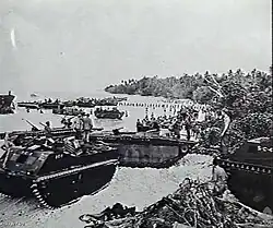 The attack group arrived in the transport area at 06:05 on 20 March. The LVTs were launched, and the assault troops transferred to the amphibious tractors using the APDs' boats, supplemented by those from Callaway while Vought F4U Corsairs of VMF-218 flew overhead to make a last-minute check of the island for any signs of the Japanese. The assault waves touched down on schedule. The reserve 3rd Battalion's boats grounded on the reef soon afterwards, and its marines waded ashore through knee deep water. The only problem encountered was with launching the LCTs carrying the tanks. The LSD's flooding mechanism failed and the LCTs had to be dragged out by a fleet tug.[13] While the detachment sent to occupy Elomusao Island was approaching the beach, some supposed opposition caused the amphibious tractors and then a destroyer to open fire, and a man was wounded by a shell fragment. However, the natives informed the marines that the Japanese had left Emirau two months before and only a small detachment remained on Mussau Island.[14] Supplies began landing at around 11:00, first from the APDs and then from Callaway. Some 3,727 troops and 844 tons of cargo were ashore by nightfall when the ships sailed.[13] Within a month, some 18,000 men and 44,000 tons of supplies had been landed.[6]