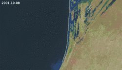 A 4 metres (13 ft) breach was cut in the peninsula near the city of Saint-Louis on 3 October 2003 to help counter possible flooding. However, the breach quickly widened to 800 m (2,600 ft) and separated the southern end of the peninsula permanently from the main country, effectively transforming it into an island.[5] As of December 2013 the sea had claimed over 3 km (1.9 mi) of land and had caused the loss of villages and tourist resorts in addition to changes in the flora and fauna of the peninsula.[6][7][8] By January 2020, the breach had widened to 6 km.[9]