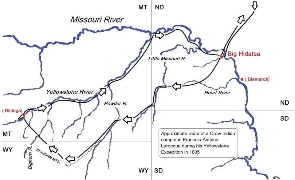 Larocque’s “Yellowstone Journal” provides a picture of the early fur trade with the Mandan and Hidatsa Indians in North Dakota. As he traveled with a Crow Indian camp on its way back home to the Yellowstone, Larocque described the various countrysides from the Hidatsa village Big Hidatsa at Knife River, upstream Powder River and along the Bighorn Mountains. During the 2½ months long journey, he and the Crows made camps in the modern states of North Dakota, Wyoming and Montana. Probably, Larocque’s detailed record gives “a better understanding of the day-to-day rhythm of camp movement and the factors conditioning this movement than any other known document …” on a typical plains people.[1]: 147 It also adds to the history and ethnography of the Crows.[2]: 156