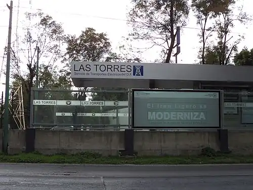 Las Torres light rail station is one of the stations on the Xochimilco Light Rail in Mexico City. Managed by the Servicio de Transportes Eléctricos, it is located between Tasqueña and Ciudad Jardín stations.[1]