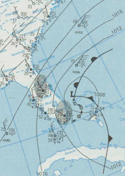 When a cyclone aloft cut off from the main band of the Westerlies, it spurred cyclogenesis in the Florida Straits by November 22, which led to a nor'easter at an unusually southern latitude near the Bahamas. The surface cyclone slowly traveled through the Florida Straits up the Gulf Stream between Florida and the Bahamas before drifting back out to sea. The storm attempted to gain some central convection during several periods of its life cycle. It was at its most intense on November 23 and November 24, with a central pressure near 1005 hPa.[2] The cyclone moved far enough to the east to allow winds and seas to subside on November 26. There is some evidence that it may have become a subtropical cyclone around November 28, while located in the vicinity of Bermuda.[3] This is why the system is considered the 19th tropical depression of the 1984 Atlantic hurricane season.[4]