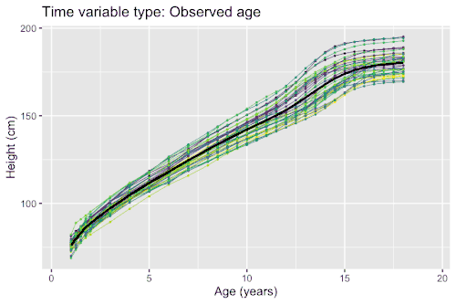 Estimation of a mean height curve (black) for boys from the Berkeley Growth Study with and without warping. The warping is based on latent variables that maps age to a synchronized biological age using a nonlinear mixed-effects model.[3]