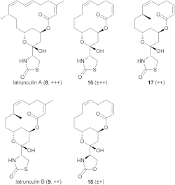 There are several isomers of latrunculin, A, B, C, D, G, H, M, S and T. The most common structures are latrunculin A and B. Their formulas are respectively C22H31NO5S and C20H29NO5S. The macrolactone ring on top that contains double bonds is a structural feature of the latrunculin molecules. The side chain contains an acylthiazolidinone substitute. Besides these natural occurring forms, scientist have made synthetic forms with different toxic strengths. Figure 2 shows some of these forms with their relative ability to disrupt microfilament activity. Semisynthetic forms that contained N-alkylated derivates were inactive.[7]