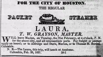 ![]() Advertisement for Steamboat Laura from Telegraph and Texas Register (Columbia, TX), Feb. 21, 1837