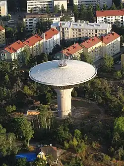 The Lauttasaari water tower was located on top of the Kotkavuori hill in Lauttasaari. It was built in 1958.[5]: 26 As soon as the tower was completed it became a local landmark, and later a kind of symbol of Lauttasaari.[2]: 68 The tower was the first mushroom-shaped water tower in Finland, and because of this, it was regarded as an architecturally and historically significant building.[3]: 1 [6] Several other mushroom-shaped water towers have later been built in Finland.[5]: 26