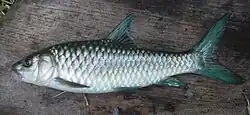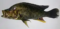 The top sportfish caught in the rivers here is a large, green fish locally known as mpifu (or ntifu?), this is a type of yellowfish only found regionally.[1][7] In 2011 this was first identified as a species similar to Labeobarbus trachypterus,[8] it may be Labeobarbus stappersi.[10] It is found in forested, rocky areas in the fast-flowing main channel and rapids of the Lukulu river.[8] Other sportfish are breams such as a large nembwe-like Serranochromis (locally known as nsuku?) and redbreast kurper (Coptodon rendalli), which are found in the same river habitat as the above yellowfish, and thinface largemouth (Serranochromis angusticeps) which is found in woodland streams.[1][8][10] Other breams found in these streams are Serranochromis thumbergi, vlei kurper or banded bream (Tilapia sparrmanii),[8] and three spot bream (Oreochromis andersonii).[1]