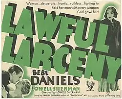 Lawful Larceny is a 1930 American pre-Code melodramatic film, directed by Lowell Sherman from Jane Murfin's screenplay. The screenplay, a melodrama, was based on the play of the same name by Samuel Shipman, which originally was a comedy. It starred a staple of the early RKO stable, Bebe Daniels, along with Kenneth Thomson, Olive Tell and Lowell Sherman, who reprised the role he had created in the original Broadway play. This film was a remake of the 1923 silent film version of the same name, produced by Famous Players–Lasky Corporation.