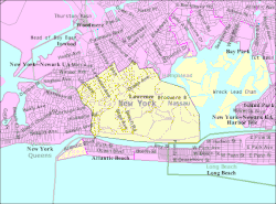 - ^ Barron, James. "If You're Thinking Of Living In: Five Towns", The New York Times, July 10, 1983. Accessed June 21, 2024. "The basic five are Lawrence, Cedarhurst, Woodmere, Hewlett and Inwood. But the area also includes some unincorporated communities and two tiny villages, Hewlett Bay Park and Woodsburgh, that are not added to the final total."