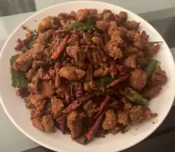Laziji (simplified Chinese: 辣子鸡; traditional Chinese: 辣子雞; pinyin: làzijī; lit. 'spicy chicken'), also known as dry chili chicken, firecracker chicken, Chongqing chicken, and mala chicken, is a dish of chicken cubes stir-fried in chilis, Sichuan pepper, spicy fermented bean paste, garlic, and ginger.[1] [2]