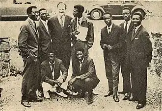 ![]() African Jazz in 1961, featuring prominent members such as Le Grand Kallé, Charles "Déchaud" Mwamba, Docteur Nico, Tabu Ley Rochereau, and Roger Izeidi | |